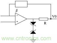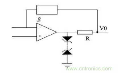 (3)輸出保護。當集成運放過載或輸出端短路時,若沒有保護電路,該運放就會損壞。但有些集成運放內(nèi)部設置了限流保護或短路保護,使用這些器件就不需再加輸出保護。對于內(nèi)部沒有限流或短路保護的集成運放,可以采用下圖所示的輸出保護電路。在下圖電路中,當輸出保護時,由電阻R起限流保護作用。
