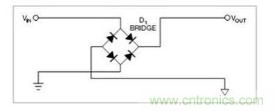圖2是一個(gè)橋式整流器,不論什么極性都可以正常工作,但是有兩個(gè)二極管導(dǎo)通,功耗是圖1的兩倍。