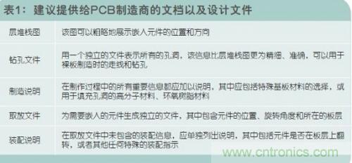 在設(shè)計(jì)嵌入元件時(shí),為了確保成功無(wú)誤,重要的一點(diǎn)是與PCB制造商充分的溝通,表1中羅列出了建議提供給PCB制造商的文檔以及設(shè)計(jì)文件。