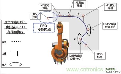 除了激光拼焊,激光飛行焊也已經(jīng)被廣泛應(yīng)用于汽車車身及其他零部件的焊接。激光飛行焊是將振鏡焊接頭與機(jī)器人的運(yùn)動結(jié)合起來,實現(xiàn)高效靈活的激光焊接。振鏡(PFO)及飛行焊的原理見圖4、5、6。其中PFO可以通過兩片鏡片的旋轉(zhuǎn),實現(xiàn)激光焦點(diǎn)在工件上的快速靈活移動和定位,可以大大提供激光焊接時的動態(tài)性能,更加高效。而機(jī)器人則可以擴(kuò)展焊接范圍,以實現(xiàn)更大零件的焊接。兩者的結(jié)合,則可以實現(xiàn)優(yōu)勢互補(bǔ),達(dá)到高效、靈活、低成本的激光焊接。