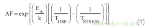 JEDEC和AEC標(biāo)準(zhǔn)均基于健全完善的基本原理,不過(guò)技術(shù)上比較落后。雖然通過(guò)硅產(chǎn)品質(zhì)量鑒定是一件有價(jià)值的、里程碑式的重大事件,但是用戶需要一個(gè)能夠在實(shí)際使用條件下,在所需的使用壽命內(nèi),比如說(shuō)10年,以低故障率持續(xù)運(yùn)行的產(chǎn)品。因此,推出FRAM、成比例CMOS、GaN等新技術(shù)的公司需要了解這些標(biāo)準(zhǔn)的基本原理。在JEDEC質(zhì)量鑒定方法體系中,主要的促進(jìn)要素是溫度。根據(jù)方程式eq.(1)計(jì)算出加速因子 (AF),在這里EA是激活能量,而k是玻爾茲曼常數(shù)。