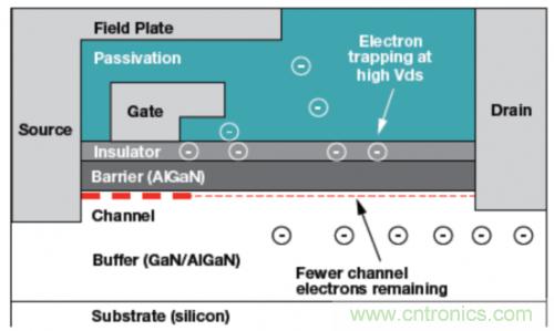 圖1:一個(gè)GaN器件的電路橫截面顯示被陷獲的電子如何通過(guò)減少通道層中的電子數(shù)量來(lái)增加Rds導(dǎo)通電阻。