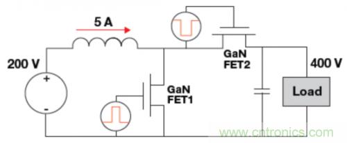 當(dāng)GaN FET關(guān)閉時(shí),電感器電流通過(guò)一個(gè)二極管再次流至輸入端,這就免除了對(duì)負(fù)載電阻器的需要,并且能夠達(dá)到節(jié)能的目的。這個(gè)單元與處于連續(xù)電流模式下的電感器一同運(yùn)行。由于目標(biāo)是開(kāi)關(guān)變換,通過(guò)使用短占空比,可以達(dá)到節(jié)能的目的。這個(gè)元件能夠改變施加的電壓、電流、頻率,以及器件所處環(huán)境的溫度。額外的漏電流(圖4)由二極管電容提供。