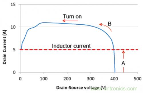 器件應(yīng)力由使用圖2中所示拓?fù)涞纳龎恨D(zhuǎn)換器顯示。圖3中顯示的是初級(jí)側(cè)開(kāi)關(guān) (FET1) 上硬開(kāi)關(guān)接通變換的仿真結(jié)果。輸入電壓為200V,而電感器電流為5A(負(fù)載電流大約為2.5A)。在這個(gè)情況下,當(dāng)FET1關(guān)閉時(shí),由于鉗制FET (FET2) 導(dǎo)電,它的漏電壓大約鉗制在400V。因此,當(dāng)FET1接通時(shí),它需要在Vds開(kāi)始下降之前灌入整個(gè)電感器電流(區(qū)域A)。