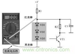 檢測(cè)這一電路中的3只二極管最為有效的方法是測(cè)量二極管上的直流電壓,如圖所示是測(cè)量時(shí)接線示意圖。如果測(cè)量直流電壓結(jié)果是1.8V左右,說(shuō)明3只二極管工作正常;如果測(cè)量直流電壓結(jié)果是0V,要測(cè)量直流工作電壓+V是否正常和電阻R1是否開(kāi)路,與3只二極管無(wú)關(guān),因?yàn)?只二極管同時(shí)擊穿的可能性較小;如果測(cè)量直流電壓結(jié)果大于1.8V,檢查3只二極管中有一只開(kāi)路故障。