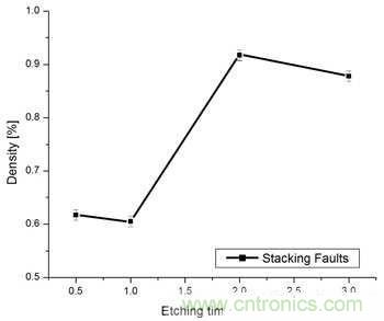 圖1.層錯密度是蝕刻時間的函數(shù),隨蝕刻時間增加而上升。
