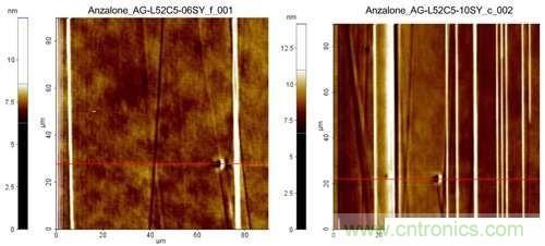 其他儀器方面,本實驗使用傅立葉變換紅外光譜儀(FT-IR)測量樣品厚度。表面分析實驗則使用Dimension 3100原子力顯微鏡(AFM)。顯微鏡為接觸測量模式,裝備一個單晶矽針尖。為取得更大的掃描區(qū)域,掃描尺寸是90×90μm2,掃描速率是1.0Hz。