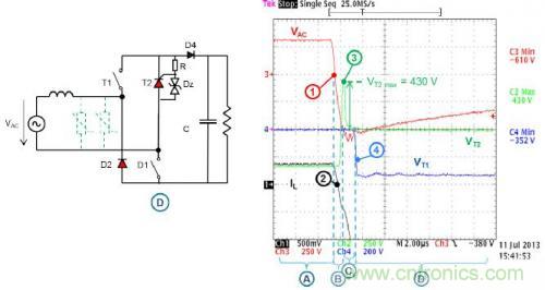 在可控硅整流管的陽(yáng)極和柵極之間連接一個(gè)過(guò)壓保護(hù)器件Transil(圖4),可以防止T2在C階段被燒毀。在C階段,電壓將會(huì)上升到Transil的擊穿電壓(VBR),觸發(fā) Transil二極管導(dǎo)通,向可控硅整流管柵極施加電流。然后,可控硅整流管導(dǎo)通。圖4描述了這種操作:
