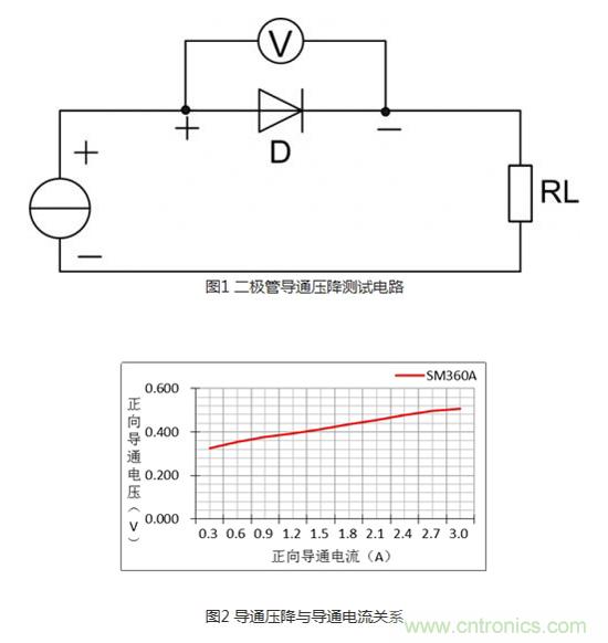 在二極管兩端加正向偏置電壓時(shí),其內(nèi)部電場(chǎng)區(qū)域變窄,可以有較大的正向擴(kuò)散電流通過PN結(jié)。只有當(dāng)正向電壓達(dá)到某一數(shù)值(這一數(shù)值稱為“門檻電壓”,鍺管約為0.2V,硅管約為0.6V)以后,二極管才能真正導(dǎo)通。但二極管的導(dǎo)通壓降是恒定不變的嗎?它與正向擴(kuò)散電流又存在什么樣的關(guān)系?通過下圖1的測(cè)試電路在常溫下對(duì)型號(hào)為SM360A的二極管進(jìn)行導(dǎo)通電流與導(dǎo)通壓降的關(guān)系測(cè)試,可得到如圖2所示的曲線關(guān)系:正向?qū)▔航蹬c導(dǎo)通電流成正比,其浮動(dòng)壓差為0.2V。從輕載導(dǎo)通電流到額定導(dǎo)通電流的壓差雖僅為0.2V,但對(duì)于功率二極管來說它不僅影響效率也影響二極管的溫升,所以在價(jià)格條件允許下,盡量選擇導(dǎo)通壓降小、額定工作電流較實(shí)際電流高一倍的二極管。