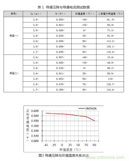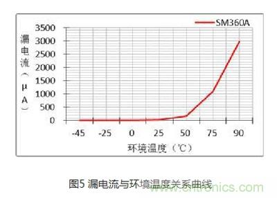 在我們開發(fā)產(chǎn)品的過程中,高低溫環(huán)境對(duì)電子元器件的影響才是產(chǎn)品穩(wěn)定工作的最大障礙。環(huán)境溫度對(duì)絕大部分電子元器件的影響無疑是巨大的,二極管當(dāng)然也不例外,在高低溫環(huán)境下通過對(duì)SM360A的實(shí)測(cè)數(shù)據(jù)表1與圖3的關(guān)系曲線可知道:二極管的導(dǎo)通壓降與環(huán)境溫度成反比。在環(huán)境溫度為-45℃時(shí)雖導(dǎo)通壓降最大,卻不影響二極管的穩(wěn)定性,但在環(huán)境溫度為75℃時(shí),外殼溫度卻已超過了數(shù)據(jù)手冊(cè)給出的125℃,則該二極管在75℃時(shí)就必須降額使用。這也是為什么