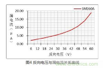 在二極管兩端加反向電壓時(shí),其內(nèi)部電場(chǎng)區(qū)域變寬,有較少的漂移電流通過PN結(jié),形成我們所說的漏電流。漏電流也是評(píng)估二極管性能的重要參數(shù),二極管漏電流過大不僅使其自身溫升高,對(duì)于功率電路來說也會(huì)影響其效率,不同反向電壓下的漏電流是不同的,關(guān)系如圖4所示:反向電壓愈大,漏電流越大,在常溫下肖特基管的漏電流可忽略。