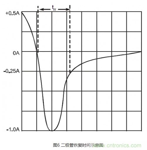 如圖6所示,二極管的反向恢復(fù)時(shí)間為電流通過零點(diǎn)由正向轉(zhuǎn)換成反向,再由反向轉(zhuǎn)換到規(guī)定低值的時(shí)間間隔,實(shí)際上是釋放二極管在正向?qū)ㄆ陂g向PN結(jié)的擴(kuò)散電容中儲(chǔ)存的電荷。反向恢復(fù)時(shí)間決定了二極管能在多高頻率的連續(xù)脈沖下做開關(guān)使用,如果反向脈沖的持續(xù)時(shí)間比反向恢復(fù)時(shí)間短,則二極管在正向、反向均可導(dǎo)通就起不到開關(guān)的作用。PN結(jié)中儲(chǔ)存的電荷量與反向電壓共同決定了反向恢復(fù)時(shí)間,而在高頻脈沖下不但會(huì)使其損耗加重,也會(huì)引起較大的電磁干擾。所以知道二極管的反向恢復(fù)時(shí)間正確選擇二極管和合理設(shè)計(jì)電路是必要的,選擇二極管時(shí)應(yīng)盡量選擇PN結(jié)電容小、反向恢復(fù)時(shí)間短的,但大多數(shù)廠家都不提供該參數(shù)數(shù)據(jù)。