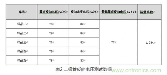 我們都知道二極管有個(gè)反向擊穿的極限電壓,絕大多數(shù)的二極管廠商都沒把它寫入數(shù)據(jù)手冊(cè),但在大多數(shù)情況下為了節(jié)省成本不可能將二極管反向耐壓降額到50%左右使用,那么反向電壓裕量是否足夠,這對(duì)評(píng)估該二極管反向耐壓應(yīng)降多少額使用較為安全是有一定意義的。從下表中可看出,反向電壓的裕量并不像網(wǎng)上所說的那樣是額定反壓的2~3倍。
