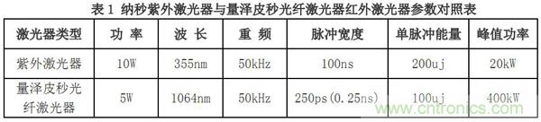 皮秒光纖激光器是在超快激光基礎(chǔ)上開發(fā)出的新一代激光器,尤其是近年來光纖器的研制成功,標(biāo)志著激光技術(shù)的一次飛躍進(jìn)步,與固體納秒激光相比,皮秒光纖激光器具有以下優(yōu)點(diǎn):1.激光脈沖寬度更窄,僅為 10^-12S,從上述材料吸收激光能量轉(zhuǎn)化為熱能的擴(kuò)散距離公式可知,這將大大減小激光加工材料時的熱擴(kuò)散距離,降低激光對材料的熱損傷;2.因脈沖寬度變窄,激光單脈沖峰值功率成倍增加,提升了激光加工材料的能力;3.光纖激光器以細(xì)小的光纖作為激光的傳輸和放大介質(zhì),與固體放大結(jié)構(gòu)相比,不僅工作穩(wěn)定,免除了周期性的調(diào)校工作,降低了維護(hù)成本,而且結(jié)構(gòu)小巧,制造成本相對較低。表1是量澤激光公司研制的光纖器與目前市面上主流的納秒級固體紫外激光器的參數(shù)對照:
