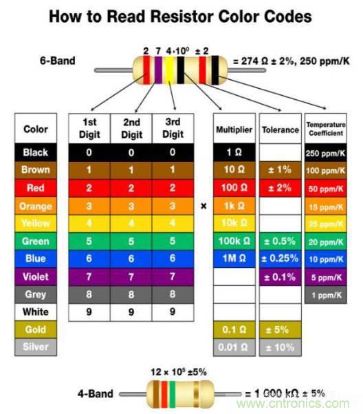 電阻器的阻值、形狀及物理尺寸多有不同。實際上,所有功率額定達到一瓦特的引線電阻器均有特定的色環(huán)組合,用以表示其電阻值、容差乃至溫度系數。電阻器通體可能會遍布三到六個色環(huán),其中以四色環(huán)最為常見。前幾個色環(huán)代表電阻值的有效數位。接下來是一個倍率色環(huán),用來左移或右移小數點的位置。最后方的色環(huán)代表容差以及溫度系數。