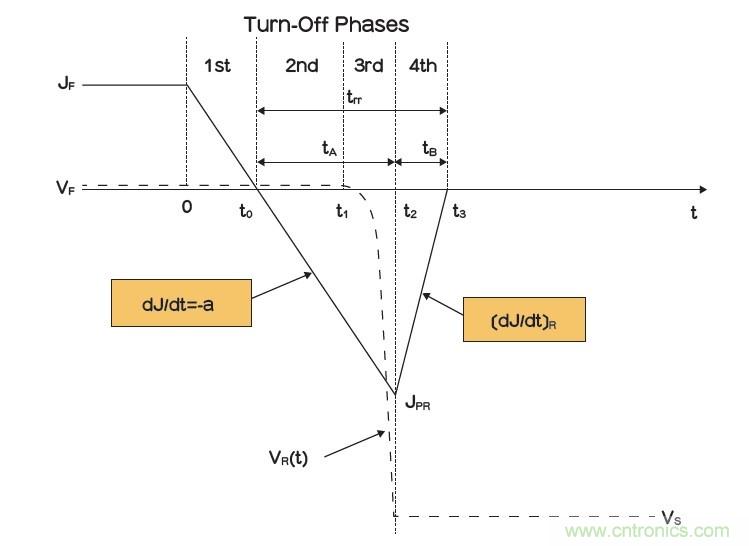 當(dāng)二極管正向偏壓變成反向偏壓時,電流不會立即降至零值,因?yàn)橄☉B(tài)期間儲存的電荷需要時間。因此,當(dāng)t=t0時,二極管開始換向操作,電流開始下降,下降斜率(-a)恒定,外部電感和電源電壓是決定斜率的唯一因素。在t1之前,二極管被施加正向偏壓,從t1到t2,二極管壓降上升,達(dá)到電源電壓;在t=t2時,反向電流達(dá)到最大值。間隔(t3-t0)被稱為反向恢復(fù)時間(trr),而負(fù)電流與零線之間的區(qū)域是反向恢復(fù)電荷(Qrr)。tB期間的電流斜率主要與產(chǎn)品設(shè)計(jì)和硅特性有關(guān)。