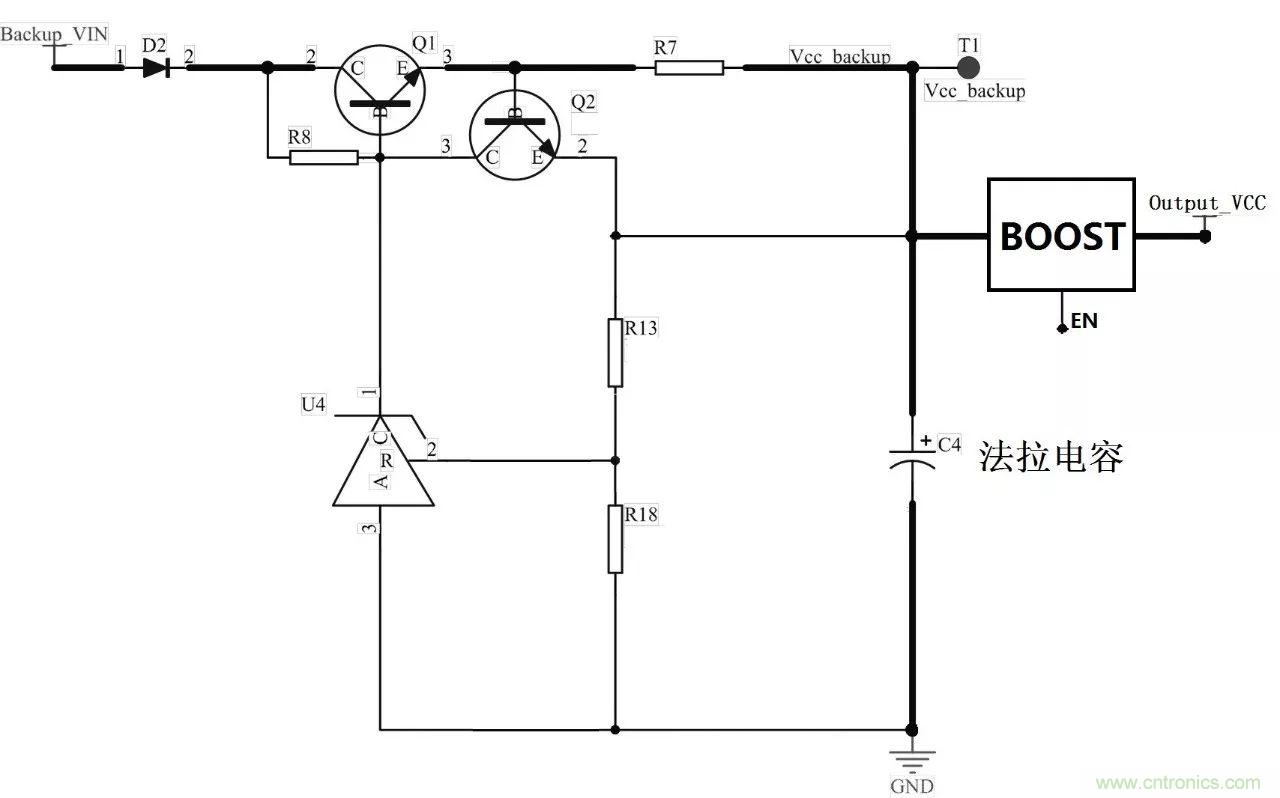 若對電壓高于法拉電容本身電壓上限的電源系統(tǒng)提供掉電續(xù)航時,Vcc_backup端需通過BOOST升壓電路后以實現(xiàn),且注意系統(tǒng)正常時(充電過程中)關(guān)斷EN腳。