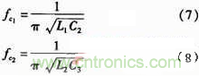 兩個肖特基整流二極管1N5822為續(xù)流二極管,這里為防止產(chǎn)生負電壓,C2、C3、C4、C5、L1、L2組成低通濾波器,其中C5、C6為瓷片電容,C2、C3用電解電容,充放電電流可以流進地,L1、L2為帶鐵芯的電感,帶鐵芯的電感對高頻的抑制比空心電感更好,電感值更高。關于參數(shù)的選取和截止頻率的計算如下