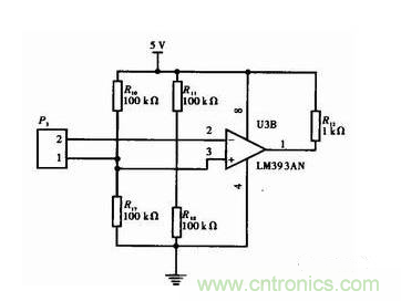 由于終端負載一定,所以電流采樣實際等同于一個峰值檢測的過程,此電路實際是一個峰值檢測電路,P3為信號的2個輸入端,調整R10,R11和R17、R18取值來實現(xiàn)峰值測功能,電路中的阻值并不準確,需要實際中根據(jù)信號的幅值來調整R10、R11和R17、R18阻值和比值。R14、R15、R19、R20的電流為模擬比較器內(nèi)部偏置電流的10倍以上,電阻的阻值盡可能大,這樣既減小了功耗也保證了系統(tǒng)的穩(wěn)定性。Y3采用模擬比較器LM393,LM393內(nèi)部為開集電極輸出,應用的時候輸出端要接一個上拉電阻,電路如圖3所示。