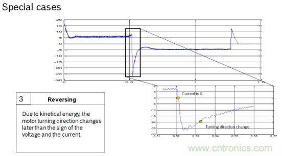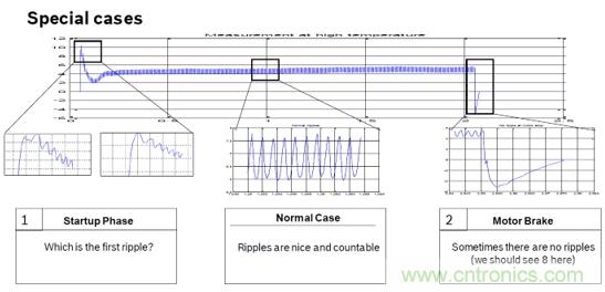 由于電機(jī)在啟動,停止,反轉(zhuǎn),堵轉(zhuǎn)時的紋波特征不明顯。如圖5和圖6,不能精準(zhǔn)的計數(shù)紋波個數(shù)。只能通過算法進(jìn)行補(bǔ)償。這樣紋波計數(shù)必然和實(shí)際的必然存在誤差。而這誤差隨著車窗操作次數(shù)的增加,誤差也會跟著累積。