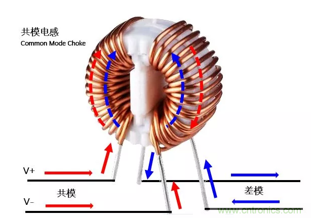 換一個(gè)方式理解:當(dāng)V+上流過一個(gè)頻率的共模干擾,形成的交變磁場(chǎng),會(huì)在另一個(gè)線圈上形成一個(gè)感應(yīng)電流,根據(jù)左手定則,感應(yīng)電流的方向與V-上共模干擾的方向相反,就抵消了一部分,減小了共模干擾。