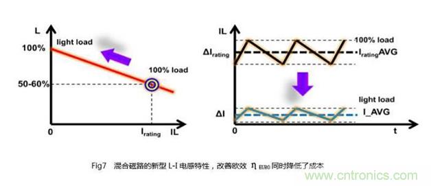 從中可知,要顯著提高其綜合效率,就必須最大限度地控制好較輕負荷時的功率損耗。利用混合磁路中不同磁材的特性,通過對其磁路長度、磁阻及繞線匝數(shù)等影響電感特性的諸要素進行優(yōu)化調(diào)節(jié),使之符合圖7所示的L-I直流電感偏置特性,從而可實現(xiàn)歐效改善與低成本設(shè)計的兼顧。