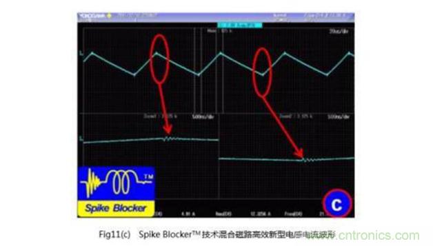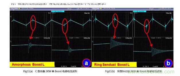 圖11(a)為目前廣為采用的C型非晶材料繞制的3 kW單Boost電感的額定功率時的典型工作電流波形。在Boost開通和關(guān)斷時,電感電流出現(xiàn)了比較嚴重的高頻振蕩,其振蕩頻率成分也比較豐富,約在20~30 MHz寬帶上;Fig11(b)為采用數(shù)只φ47的鐵硅鋁磁環(huán)繞制的3 kW單Boost電感的波形,同樣圖中顯示出10 MHz左右的高頻衰減振蕩;Fig11(C)則為采用了優(yōu)化結(jié)構(gòu)和相關(guān)設(shè)計工藝規(guī)范的Spike Blocker TM技術(shù)后,使用Hybrid Magnetics混合磁路設(shè)計的新型高效能電感的實測波形(這些測試均基于相同設(shè)備、相同輸入輸出電壓、功率、工作頻率條件),由此可見,關(guān)注電感的EMC設(shè)計工藝規(guī)范具有十分重要的意義。