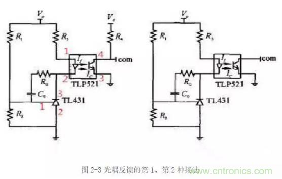 圖2-3所示接法的工作原理是:當(dāng)輸出電壓升高時,原邊電流If增大,輸出電流Ic增大,由于Ic已經(jīng)超過了電壓誤差放大器的電流輸出能力,com腳電壓下降,占空比減小,輸出電壓減??;反之,當(dāng)輸出電壓下降時,調(diào)節(jié)過程類似。