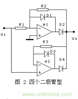 其它幾種,有的在D2導(dǎo)通的半周內(nèi),通過(guò)A2的復(fù)合實(shí)現(xiàn)A1的負(fù)反饋,對(duì)有些運(yùn)放會(huì)出現(xiàn)自激. 有的兩個(gè)半波的輸入阻抗不相等,對(duì)信號(hào)源要求較高。
