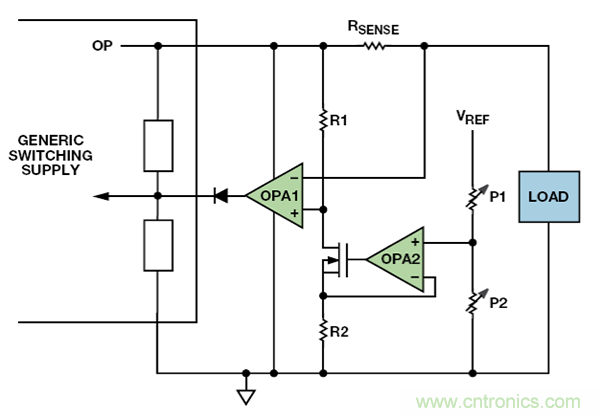 為了得到可變的電流,將基準電壓——來自黑磚頭或本地——施加于P1 和P2 所代表的電位計。OPA2 和MOSFET通過R1 輸出小電流,在其上產生壓降。負載電流流過檢測電阻。若檢測電阻上的電壓由于負載電流超過R1 上的壓降而有所下降,那么OPA1 輸出將上升,覆蓋磚頭中的電壓控制,并限制其輸出電壓,防止輸出電流超過限值。