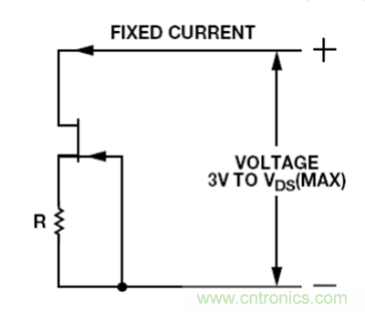 若精度不是問題,且只要求剛性單極性電流源,則可以采用耗盡型JFET和一個電阻組成電流源。如圖 12 所示,這種配置在溫度發(fā)生變化時并不十分穩(wěn)定,且對于給定的R值,各器件的電流可能有相當大的差異,但該配置簡單而廉價。