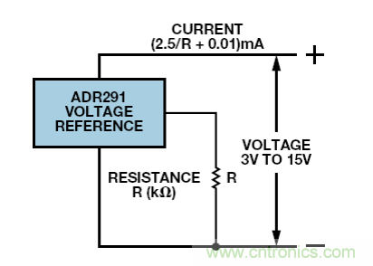目前為止,我們討論的電路都是具有精密電流輸出的放大器。當然,它們能夠與固定輸入一同使用,提供精密電流源,但構建一個更簡單的雙端電流源也是可行的。低電流基準電壓源ADR291 具有 10 μA左右的待機電流,典型溫度系數為 20nA/°C。如圖 11 所示,加入負載電阻后,則 3 V至 15 V電源范圍內的基準電流為(2.5/R + 0.01) mA,其中R為負載電阻,單位是kΩ。