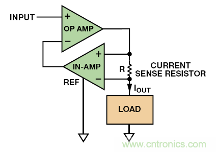 現在,高性能儀表放大器售價不高,因此使用一個運算放大器、一個儀表放大器和一個電流檢測電阻組成雙極性電流源極為方便,如圖 10 所示。這類電路比Howland電流泵要更為簡單,不依賴于電阻網絡(除了集成儀表放大器的那種),且電壓擺幅在每個電源的 500 mV以內。