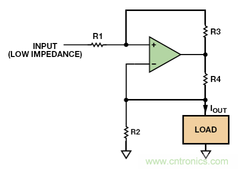 目前為止,我們討論的電路都是單極性的——電流在一個方向上流動——但雙極性電流電路也是可行的。最簡單、使用最廣泛的當數Howland電流泵,如圖 9 所示。這款簡單的電路有很多問題:它對電阻匹配的精度要求極高,以獲得高輸出阻抗;輸入源阻抗會增加R1 電阻,因此它的數值必須非常低以最大程度降低匹配誤差;電源電壓必須比最大輸出電壓高得多;并且運算放大器的CMRR性能必須相對良好。