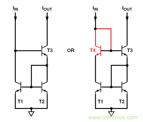 若早期電壓影響很大,則可使用略為復雜的威爾遜電流鏡降至最低。3 晶體管和 4 晶體管版本如圖 3 所示。4 晶體管版本更為精確,且具有更寬的動態(tài)范圍。