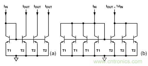 圖2. (a) 多級電流鏡 (b) 非整數比例電流鏡可將 3 個 T2 集電極結合起來,得到 3IIN