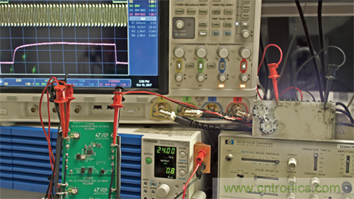LT3932演示電路(DC2286A)設(shè)計(jì)為通過一個(gè)或兩個(gè)LED(作為降壓LED驅(qū)動(dòng)器)驅(qū)動(dòng)1 A的LED電流。如圖1所示,它很容易進(jìn)行更改和并聯(lián),以實(shí)現(xiàn)更高電流、更高電壓或并聯(lián)運(yùn)行。圖4顯示了如何將兩個(gè)這樣的電路輕松連接在一起,從24 V輸入以10μs、3 A脈沖驅(qū)動(dòng)4個(gè)LED。出于測試目的,脈沖發(fā)生器可用于提供同步時(shí)鐘信號,如圖4所示。在量產(chǎn)機(jī)器視覺系統(tǒng)中,可利用時(shí)鐘芯片生成同步時(shí)鐘信號和PWM脈沖。如需更高電流脈沖,可使用相同的并聯(lián)方案添加更多演示電路DC2286A轉(zhuǎn)換器。