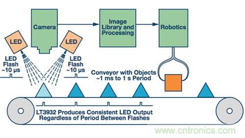幸運(yùn)的是,LT3932高速LED驅(qū)動(dòng)器可為高達(dá)2 A的LED串提供機(jī)器視覺相機(jī)閃光燈,關(guān)斷時(shí)間可以長達(dá)1秒、1小時(shí)、1天或更長時(shí)間。LT3932的特殊相機(jī)閃光燈功能允許其保持輸出電容和控制環(huán)路充電狀態(tài),哪怕是在長關(guān)斷時(shí)間內(nèi)。對輸出和控制環(huán)路電容的狀態(tài)進(jìn)行采樣后,LT3932繼續(xù)在長關(guān)斷期間對這些元件進(jìn)行涓流充電,以補(bǔ)償通常都會(huì)有的漏電流,而這是其他LED驅(qū)動(dòng)器未予考慮的。