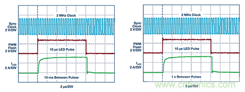 圖2. 無論P(yáng)WM關(guān)斷時(shí)間是多少,圖1所示并聯(lián)LED驅(qū)動(dòng)器的3 A相機(jī)閃光波形看起來相同。波形顯示,(a) 10 ms之后和(b) 1 s之后的10μs脈沖是相同的。經(jīng)過一天或更長的PWM關(guān)斷時(shí)間之后,LT3932 LED閃光波形看起來也相同。