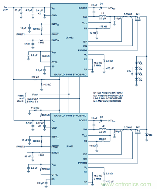 LT3932的專有閃光技術(shù)可以擴(kuò)展,驅(qū)動(dòng)器可以并聯(lián)以提供更高的LED閃光電流。所需的閃光形狀和完整性保持不變。圖1顯示了并聯(lián)兩個(gè)驅(qū)動(dòng)器以支持3 A相機(jī)閃光燈是多么容易,高達(dá)4 A的設(shè)計(jì)也是可行的。