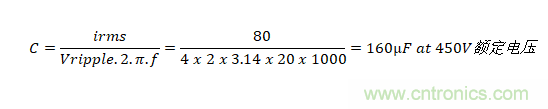 如果僅需要電容器來(lái)控制電動(dòng)汽車動(dòng)力系統(tǒng)等直流線路上的紋波電壓,則在選擇電容器時(shí)將會(huì)呈現(xiàn)顯著不同。 總線電壓可能與以前一樣為400V,但由采用電池供電,因此不存在穿越需求。在下游轉(zhuǎn)換器以20kHz的開(kāi)關(guān)頻率提取80Arms脈沖電流時(shí),將紋波限制在4Vrms以內(nèi)是非?,F(xiàn)實(shí)的, 所需的電容是: