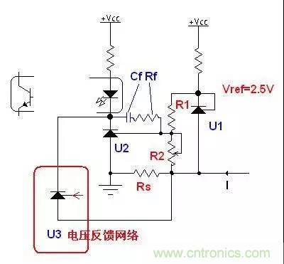 TL431 價格低廉,在開關電源的反饋環(huán)路大量應用,但其FB電壓為2.5V,直接用做電流反饋時要很大的采樣電阻,浪費電壓。圖中用兩個TL431實現電流反饋,可以用比較小的采樣電阻實現精密的電流反饋,如果還有電壓反饋網絡,再并上U3的電壓反饋電路。
