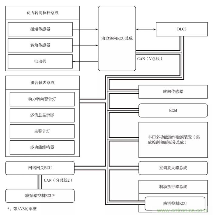 在分析方框圖了解信號(hào)或電流傳輸過(guò)程時(shí),應(yīng)認(rèn)真查看圖中的箭頭方向,箭頭方向表示信號(hào)的傳輸方向。如果沒(méi)有箭頭方向,則可根據(jù)方框圖的圖形符號(hào)來(lái)判斷。箭頭如果是雙向的,表示信號(hào)既能輸入也能輸出;方框圖中粗線條表示CAN總線,下圖所示為2016 款皇冠EPS系統(tǒng)方框圖(系統(tǒng)圖)。對(duì)方框圖有整體的了解后,應(yīng)進(jìn)一步弄清系統(tǒng)(整車或系統(tǒng))共有幾個(gè)框(多少部件),框與框之間存在何種關(guān)系,再對(duì)照電路原理圖,就可以對(duì)電路理解得更為深刻。