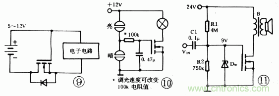 一種簡單的觸摸調(diào)光電路如圖10。當(dāng)手指觸摸上觸頭時(shí),電容經(jīng)手指電阻及100k充電,VGS漸增大,燈漸亮;當(dāng)觸摸下觸頭時(shí),電容經(jīng)