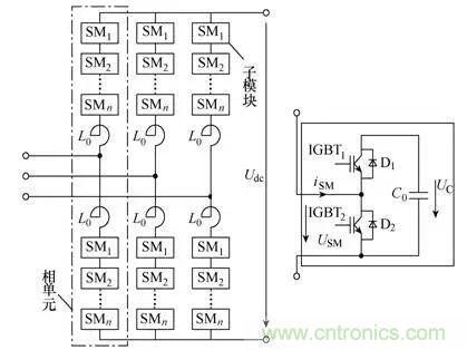 西門子公司為此設計了一種由多個子模塊串聯的模塊化多電平換流器(modular multilevel converter, MMC)。這種結構的換流器可以使全控型功率器件運行在較低的開關頻率,大大降低了電磁干擾和損耗;同時采用排序充放電電容的均壓策略,可以輕松實現數量龐大的級聯模塊的動態(tài)均壓;其模塊化結構,也便于安裝及日后的維護。因此,我國近幾年的柔直工程換流器均采用MMC結構。
