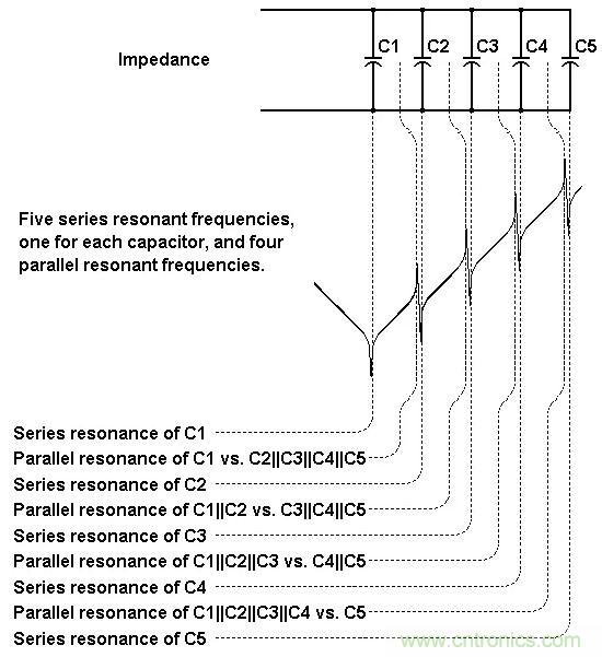 圖1:5個(gè)并聯(lián)電容的9個(gè)諧振頻率。