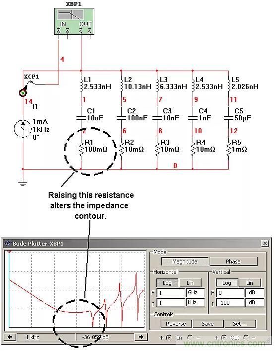 圖2:SPICE中5個(gè)電容的并聯(lián)旁路。