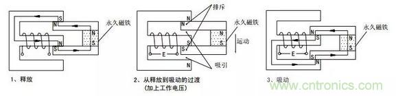 由永久磁鐵保持釋放狀態(tài),加上工作電壓后,電磁感應(yīng)使銜鐵與永久磁鐵產(chǎn)生吸引和排斥力矩,產(chǎn)生向下的運動,最后達到吸合狀態(tài)。