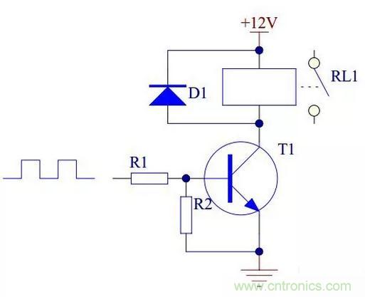 電路中各元器件的作用:晶體管T1為控制開關(guān);電阻R1主要起限流作用,降低晶體管T1功耗;電阻R2使晶體管T1可靠截止;二極管D1反向續(xù)流,為三極管由導(dǎo)通轉(zhuǎn)向關(guān)斷時為繼電器線圈中的提供泄放通路,并將其電壓箝位在+12V上。