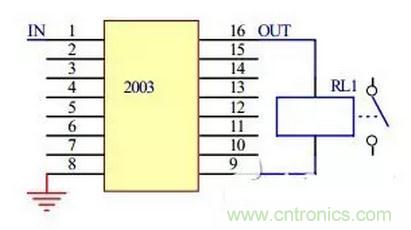 當2003輸入端為高電平時,對應(yīng)的輸出口輸出低電平,繼電器線圈兩端通電,繼電器觸點吸合;